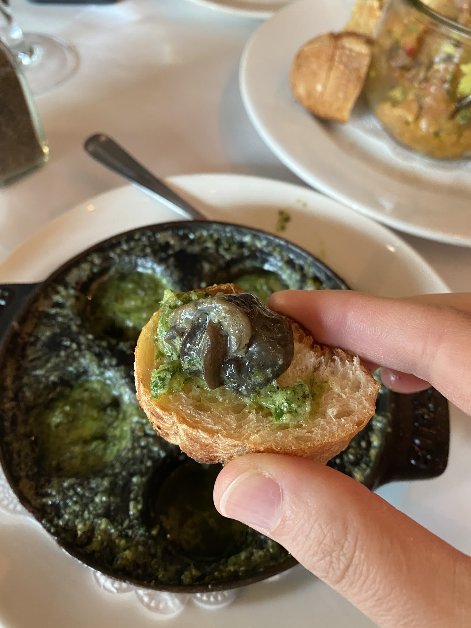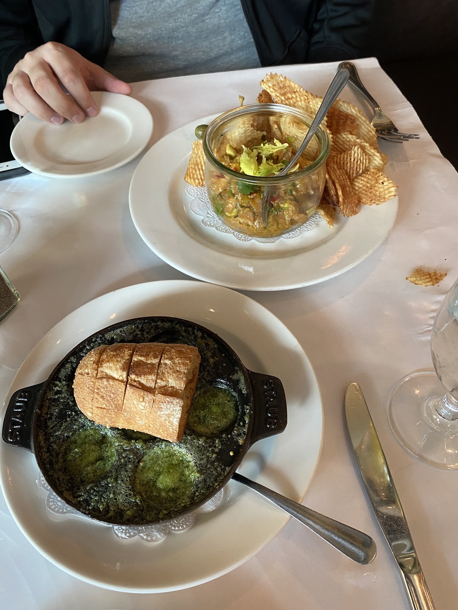 Spicy Salmon Tartare with avocado, olives, housemade chips plus Wild Escargots de Bourgogne with garlic herb butter. |